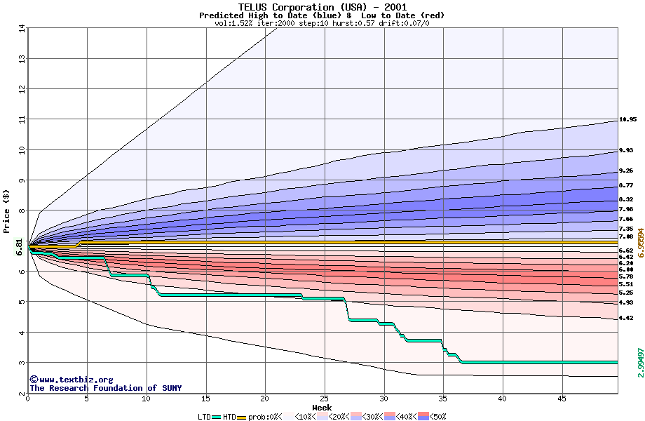 The high to date and low to date prices of the stock plotted against a random walk model for 2001 (what's this?).