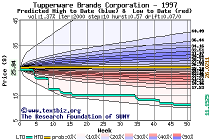 The high to date and low to date prices of the stock plotted against a random walk model for 1997 (what's this?).