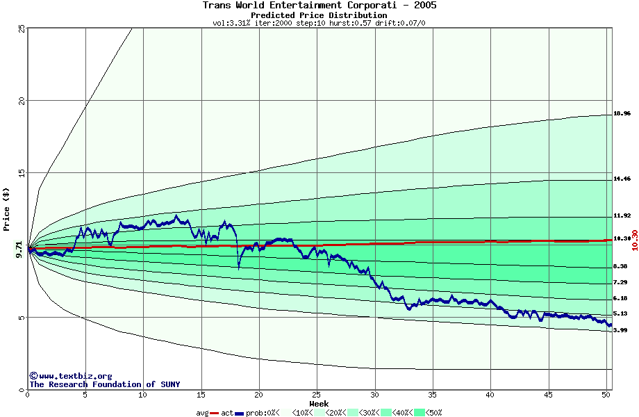 The following graph plots the year-to-date performance of the stock for 2005 compared to the probability calculated by a random walk model.