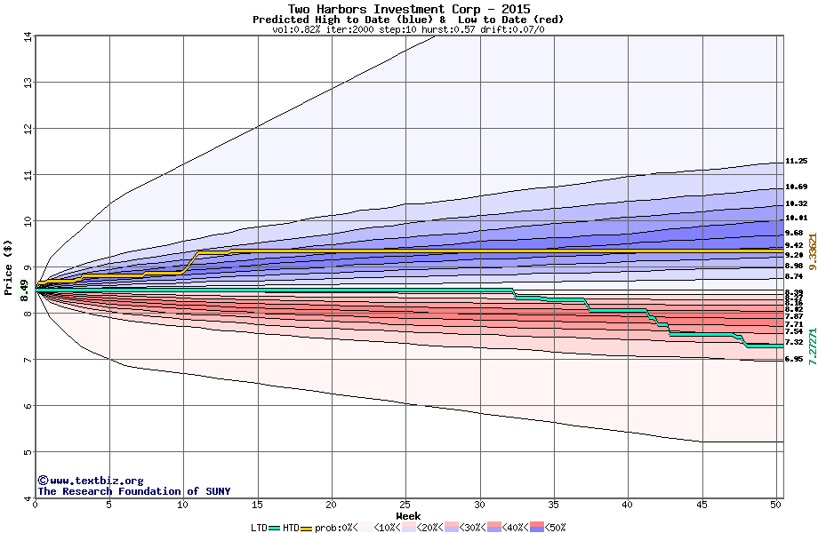 The following graph plots the year-to-date performance of the stock for 2015 compared to the probability calculated by a random walk model.