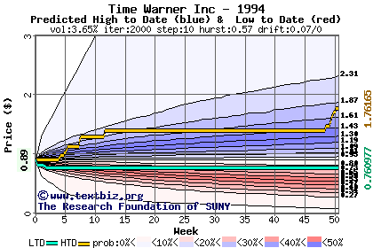 The high to date and low to date prices of the stock plotted against a random walk model for 1994 (what's this?).