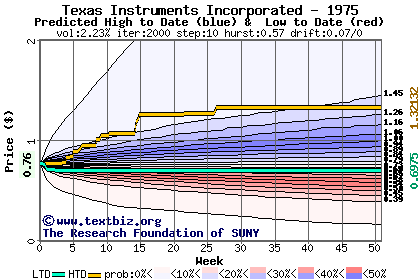 The high to date and low to date prices of the stock plotted against a random walk model for 1975 (what's this?).