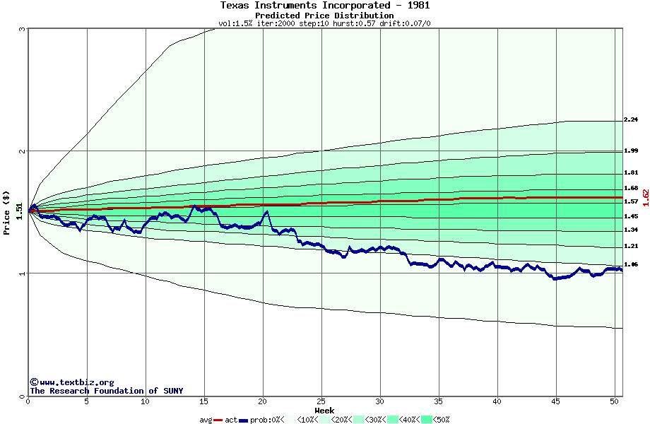 The following graph plots the year-to-date performance of the stock for 1981 compared to the probability calculated by a random walk model.