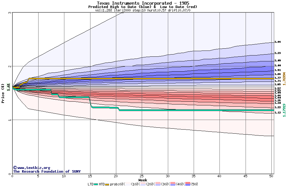 The high to date and low to date prices of the stock plotted against a random walk model for 1985 (what's this?).