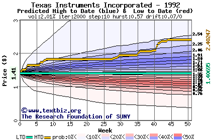 The high to date and low to date prices of the stock plotted against a random walk model for 1992 (what's this?).