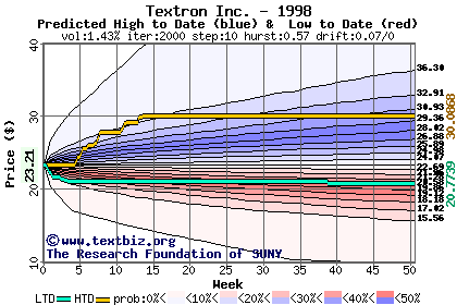 The high to date and low to date prices of the stock plotted against a random walk model for 1998 (what's this?).