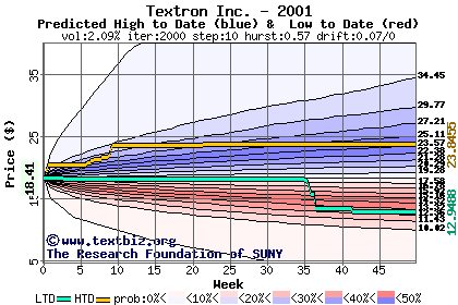 The high to date and low to date prices of the stock plotted against a random walk model for 2001 (what's this?).