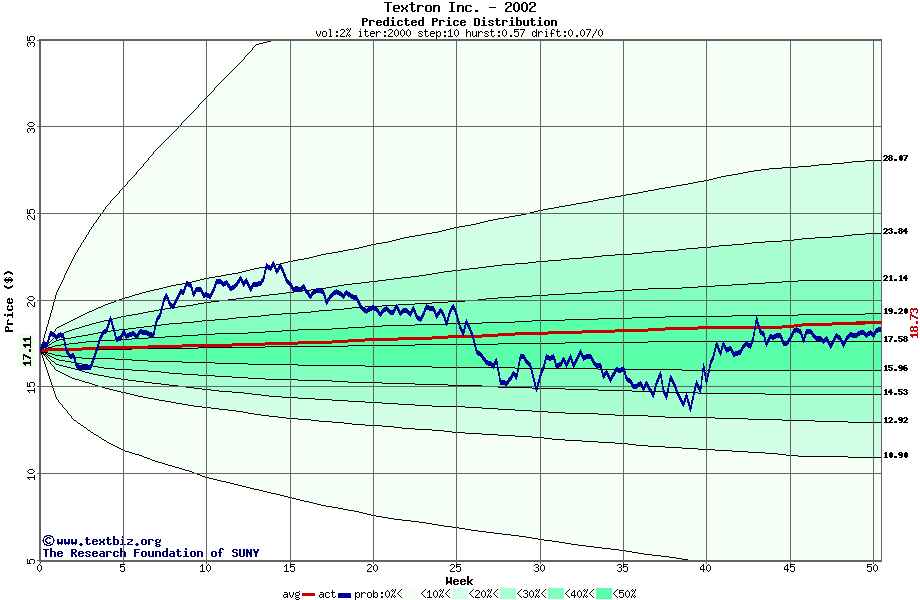 The following graph plots the year-to-date performance of the stock for 2002 compared to the probability calculated by a random walk model.