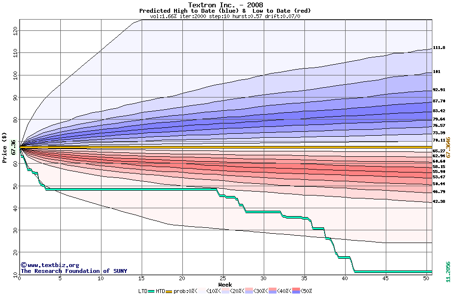 The high to date and low to date prices of the stock plotted against a random walk model for 2008 (what's this?).