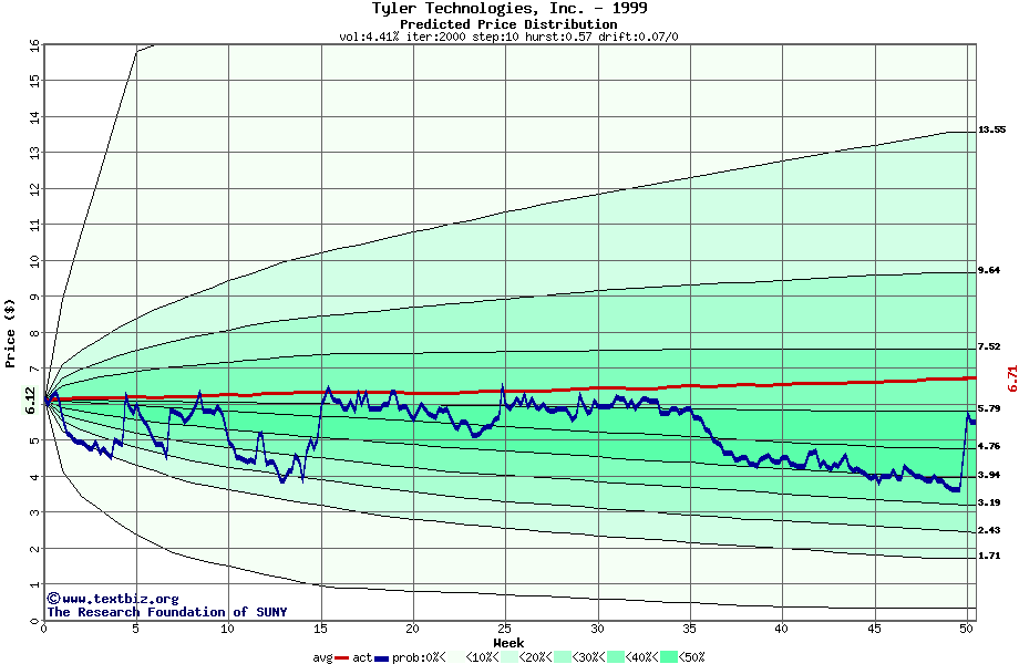 The following graph plots the year-to-date performance of the stock for 1999 compared to the probability calculated by a random walk model.