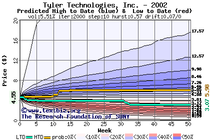 The high to date and low to date prices of the stock plotted against a random walk model for 2002 (what's this?).