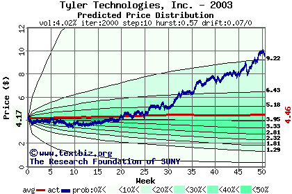 The high to date and low to date prices of the stock plotted against a random walk model for 2003 (what's this?).