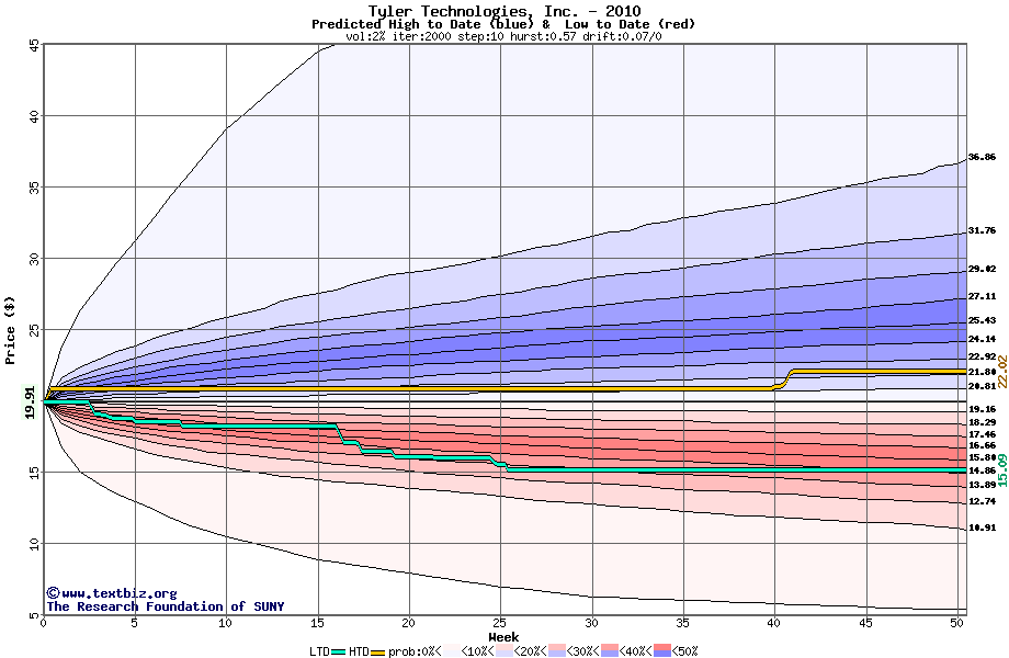 The high to date and low to date prices of the stock plotted against a random walk model for 2010 (what's this?).