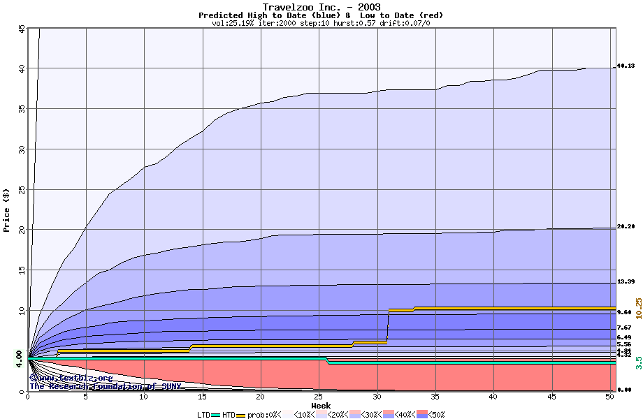 The high to date and low to date prices of the stock plotted against a random walk model for 2003 (what's this?).
