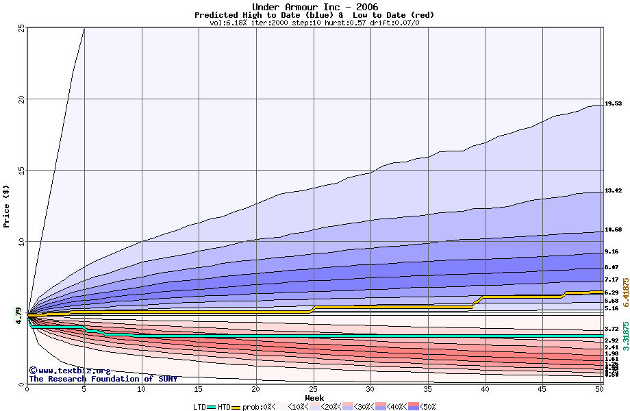 The high to date and low to date prices of the stock plotted against a random walk model for 2006 (what's this?).