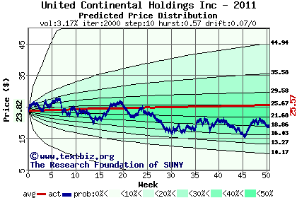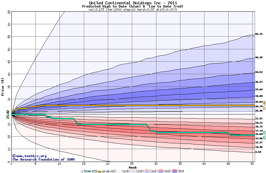 The high to date and low to date prices of the stock plotted against a random walk model for 2011 (what's this?).