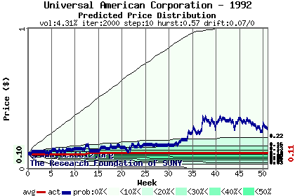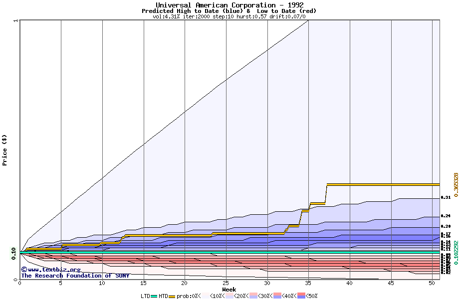 The high to date and low to date prices of the stock plotted against a random walk model for 1992 (what's this?).