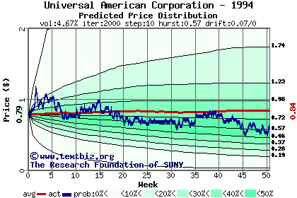 The high to date and low to date prices of the stock plotted against a random walk model for 1994 (what's this?).