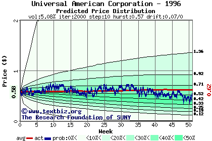 The high to date and low to date prices of the stock plotted against a random walk model for 1996 (what's this?).