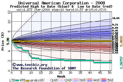 The high to date and low to date prices of the stock plotted against a random walk model for 2008 (what's this?).
