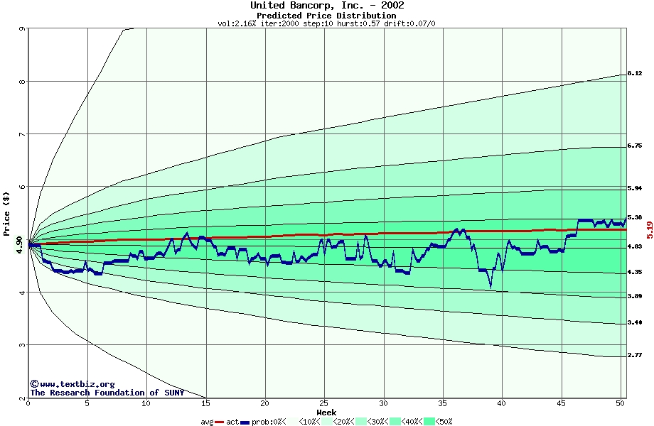 The following graph plots the year-to-date performance of the stock for 2002 compared to the probability calculated by a random walk model.
