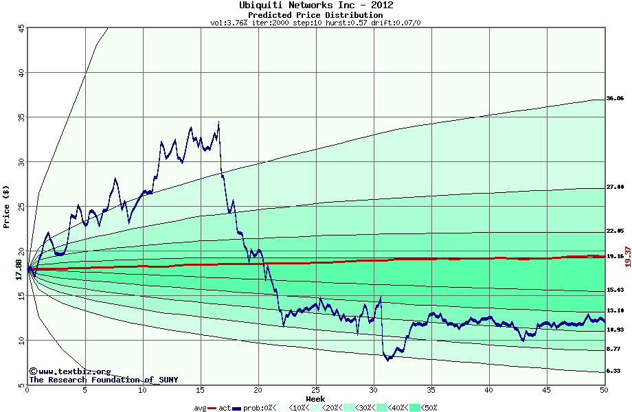 The following graph plots the year-to-date performance of the stock for 2012 compared to the probability calculated by a random walk model.