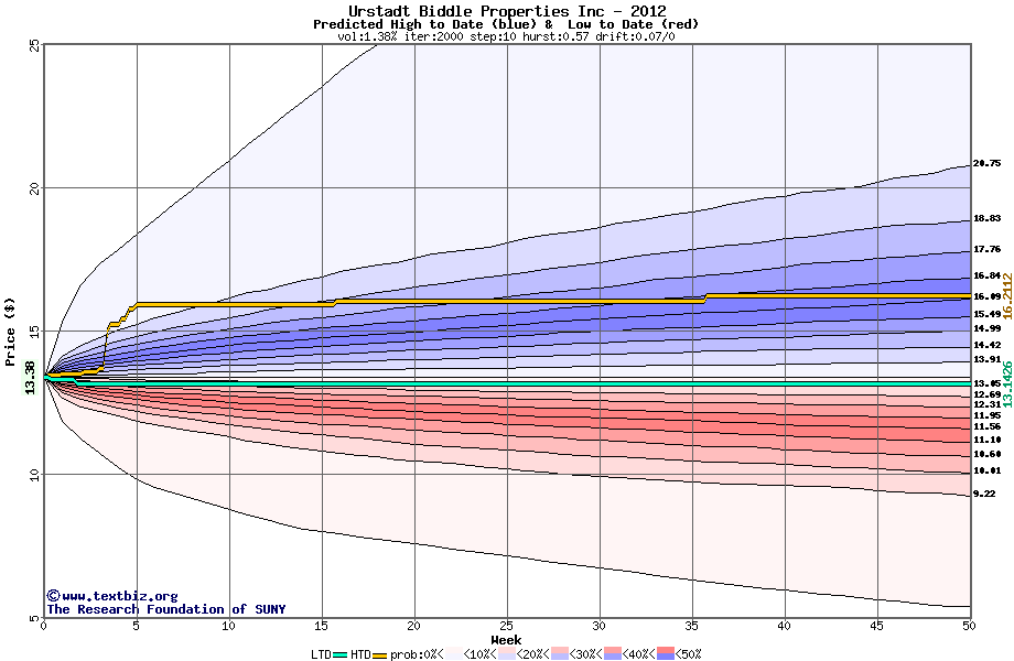 The high to date and low to date prices of the stock plotted against a random walk model for 2012 (what's this?).