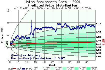 The high to date and low to date prices of the stock plotted against a random walk model for 2001 (what's this?).