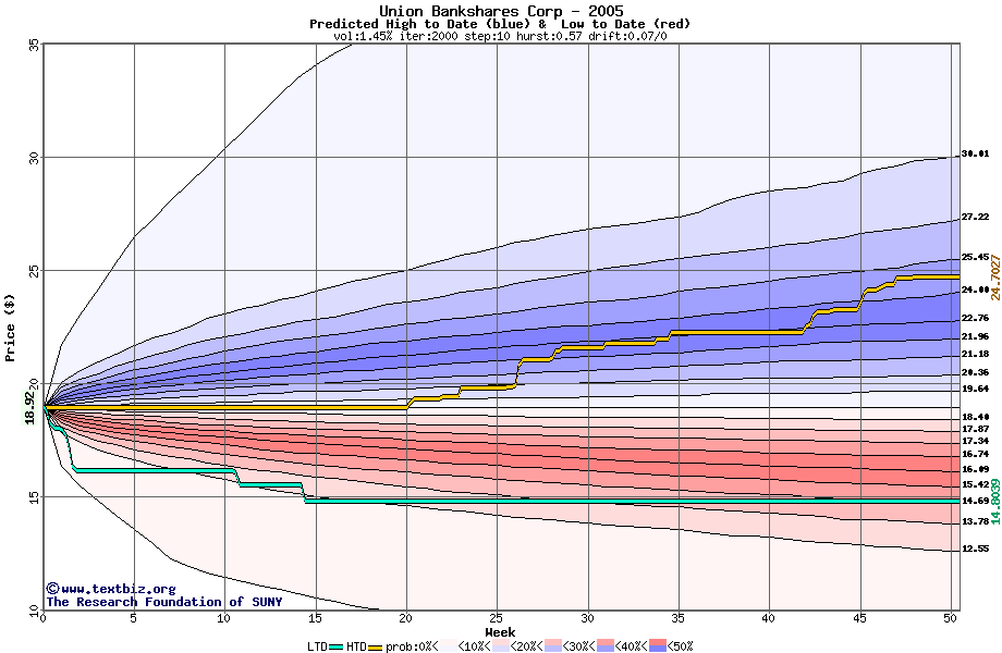The high to date and low to date prices of the stock plotted against a random walk model for 2005 (what's this?).