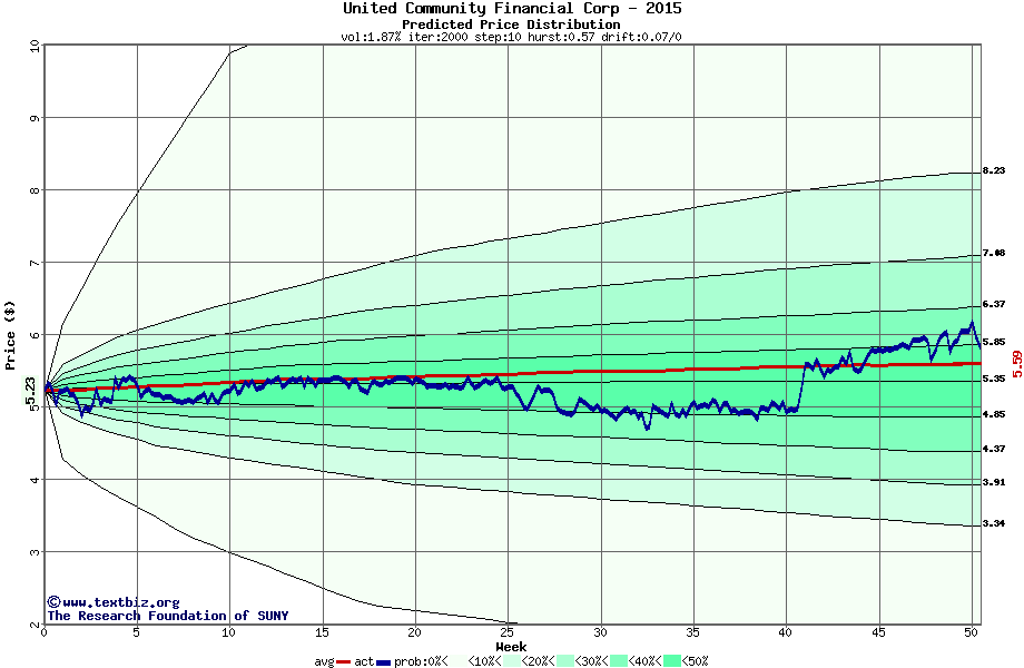 The following graph plots the year-to-date performance of the stock for 2015 compared to the probability calculated by a random walk model.