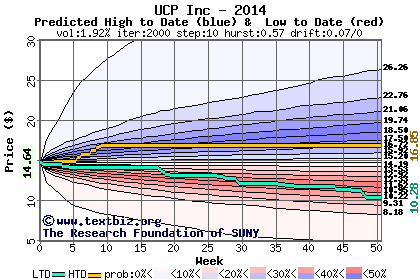 The high to date and low to date prices of the stock plotted against a random walk model for 2014 (what's this?).