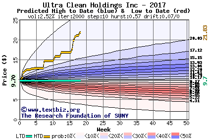 The high to date and low to date prices of the stock plotted against a random walk model for 2017 (what's this?).
