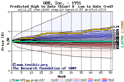 The high to date and low to date prices of the stock plotted against a random walk model for 1991 (what's this?).