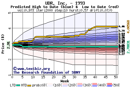 The high to date and low to date prices of the stock plotted against a random walk model for 1993 (what's this?).