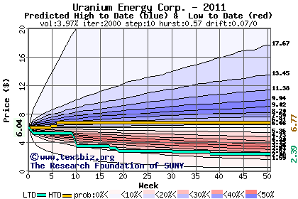 The high to date and low to date prices of the stock plotted against a random walk model for 2011 (what's this?).