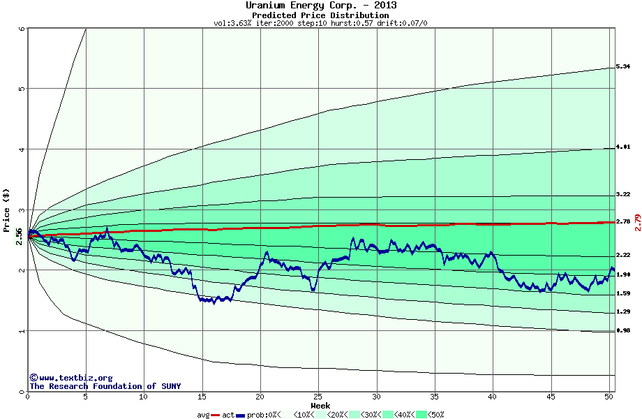 The high to date and low to date prices of the stock plotted against a random walk model for 2013 (what's this?).