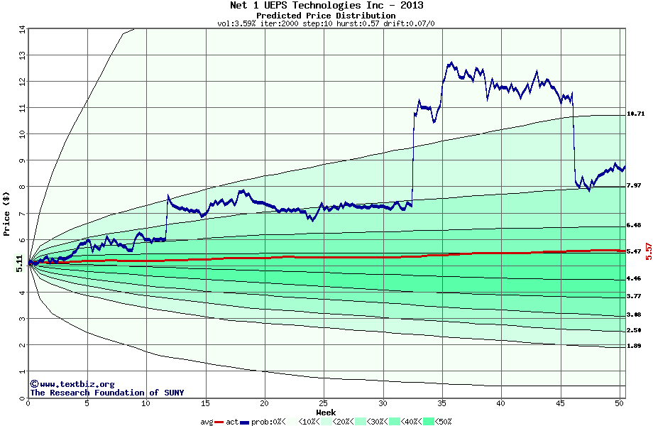 The following graph plots the year-to-date performance of the stock for 2013 compared to the probability calculated by a random walk model.