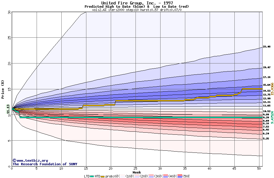 The high to date and low to date prices of the stock plotted against a random walk model for 1997 (what's this?).