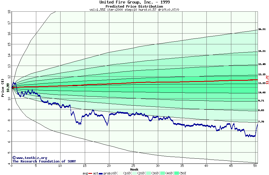 The following graph plots the year-to-date performance of the stock for 1999 compared to the probability calculated by a random walk model.
