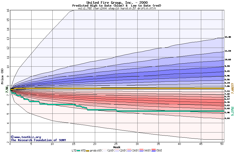 The high to date and low to date prices of the stock plotted against a random walk model for 2000 (what's this?).