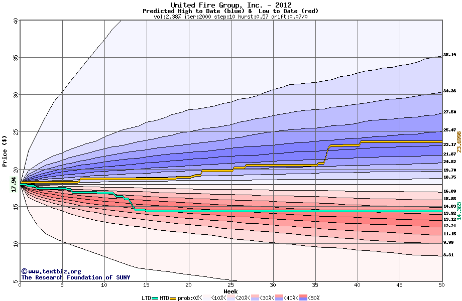 The following graph plots the year-to-date performance of the stock for 2012 compared to the probability calculated by a random walk model.