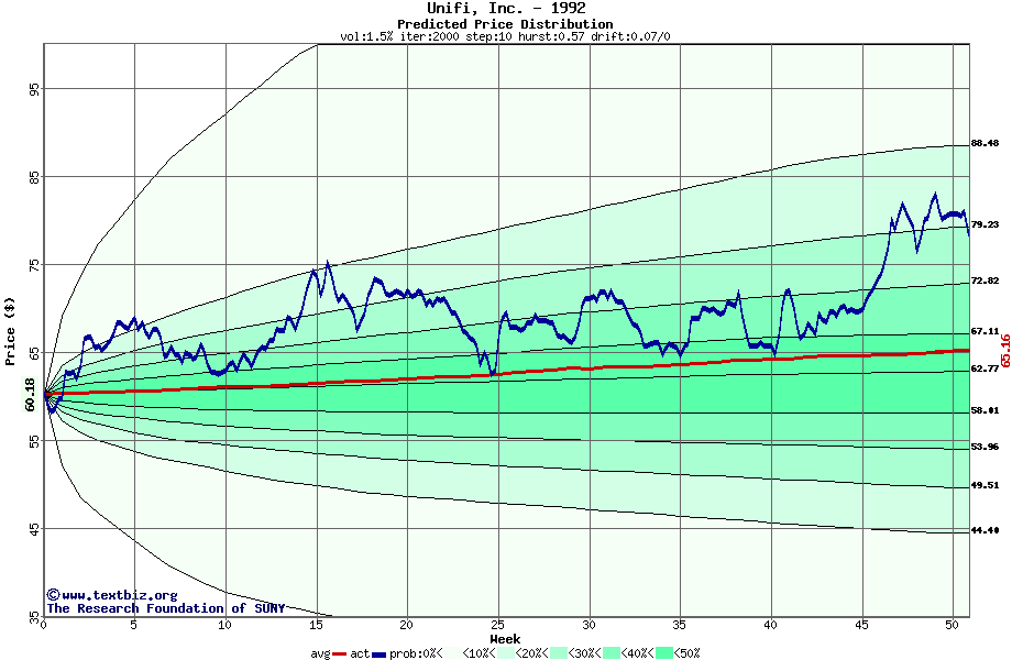 The following graph plots the year-to-date performance of the stock for 1992 compared to the probability calculated by a random walk model.