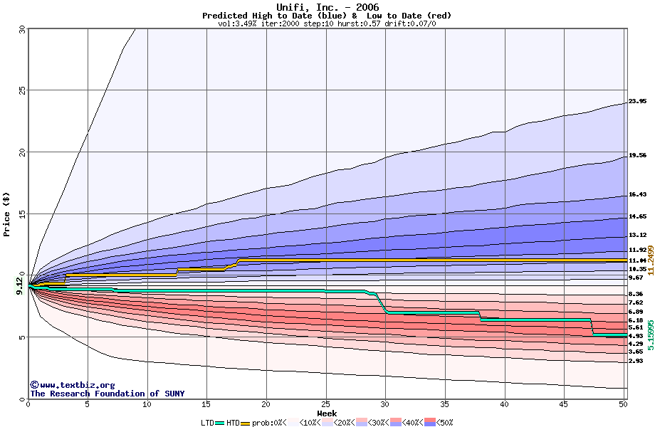The high to date and low to date prices of the stock plotted against a random walk model for 2006 (what's this?).