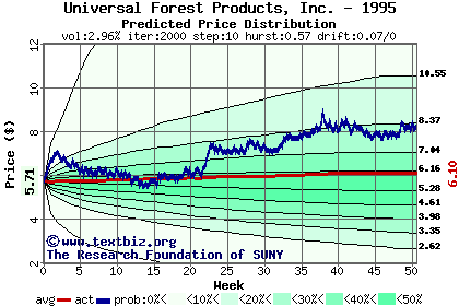The high to date and low to date prices of the stock plotted against a random walk model for 1995 (what's this?).