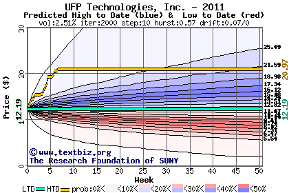 The high to date and low to date prices of the stock plotted against a random walk model for 2011 (what's this?).