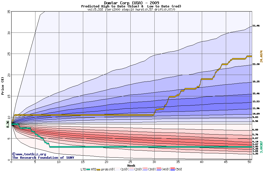 The high to date and low to date prices of the stock plotted against a random walk model for 2009 (what's this?).
