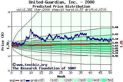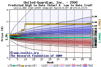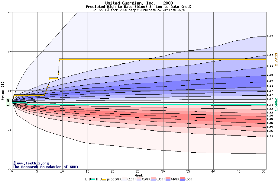 The high to date and low to date prices of the stock plotted against a random walk model for 2000 (what's this?).