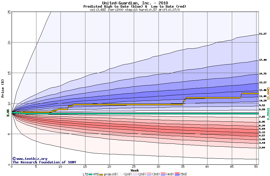 The high to date and low to date prices of the stock plotted against a random walk model for 2010 (what's this?).
