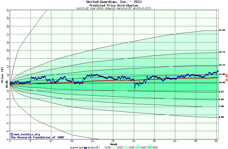 The following graph plots the year-to-date performance of the stock for 2011 compared to the probability calculated by a random walk model.