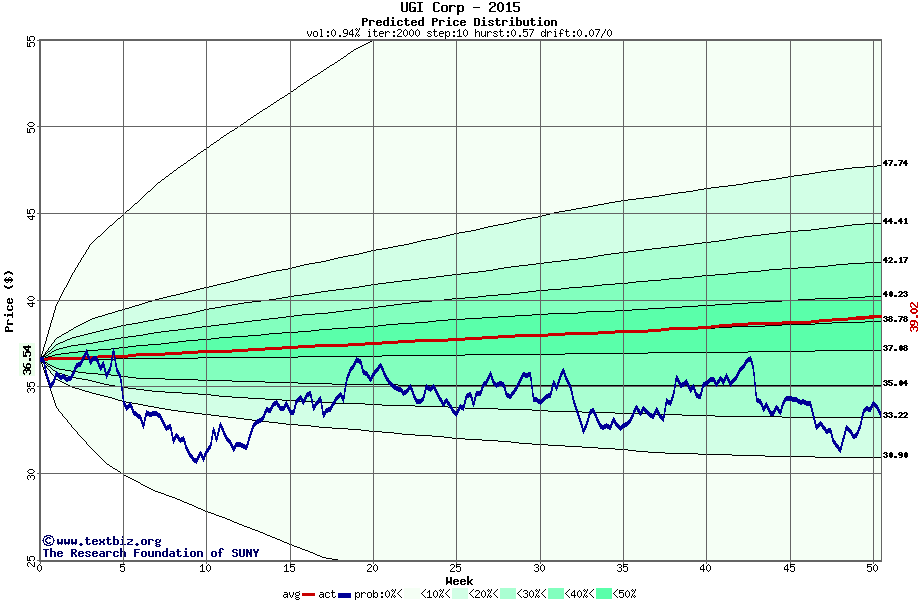 The following graph plots the year-to-date performance of the stock for 2015 compared to the probability calculated by a random walk model.